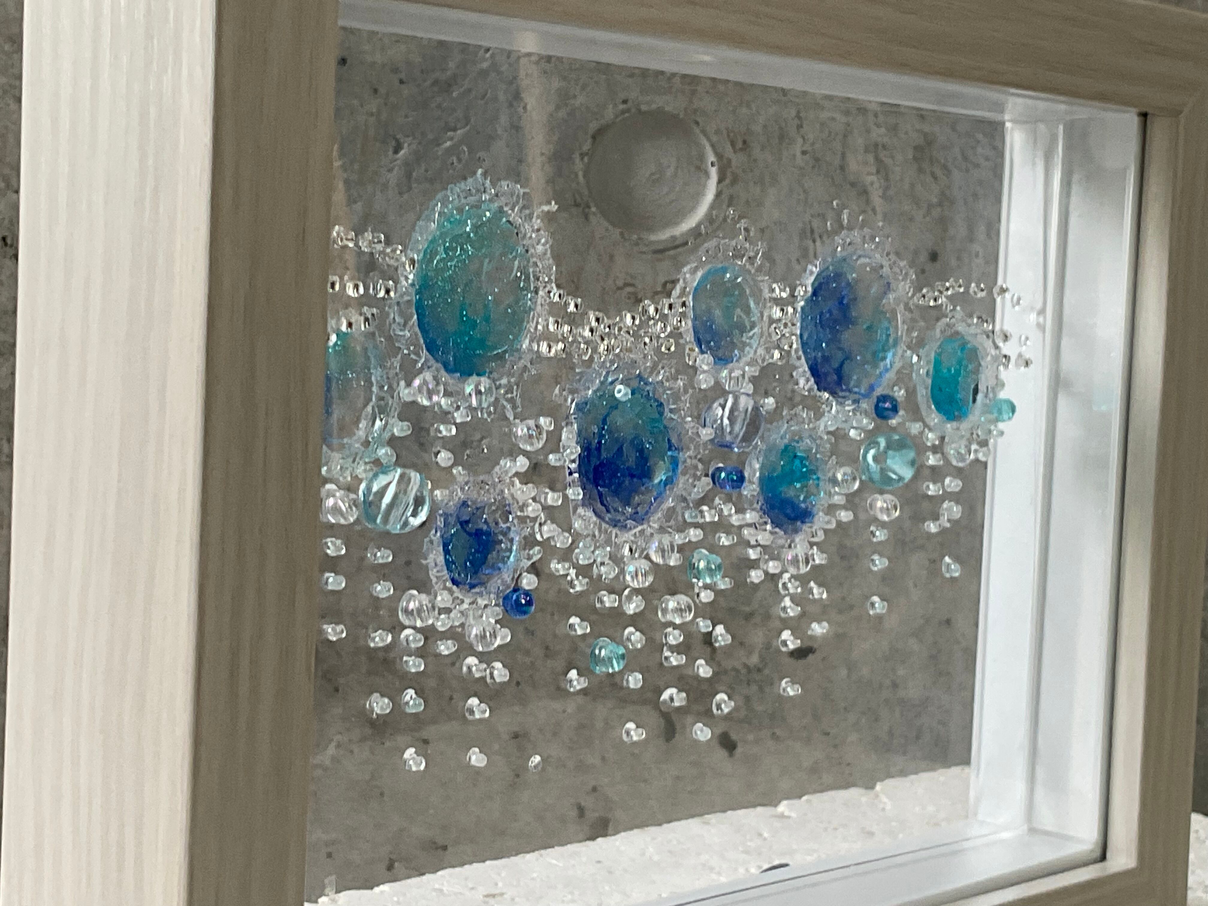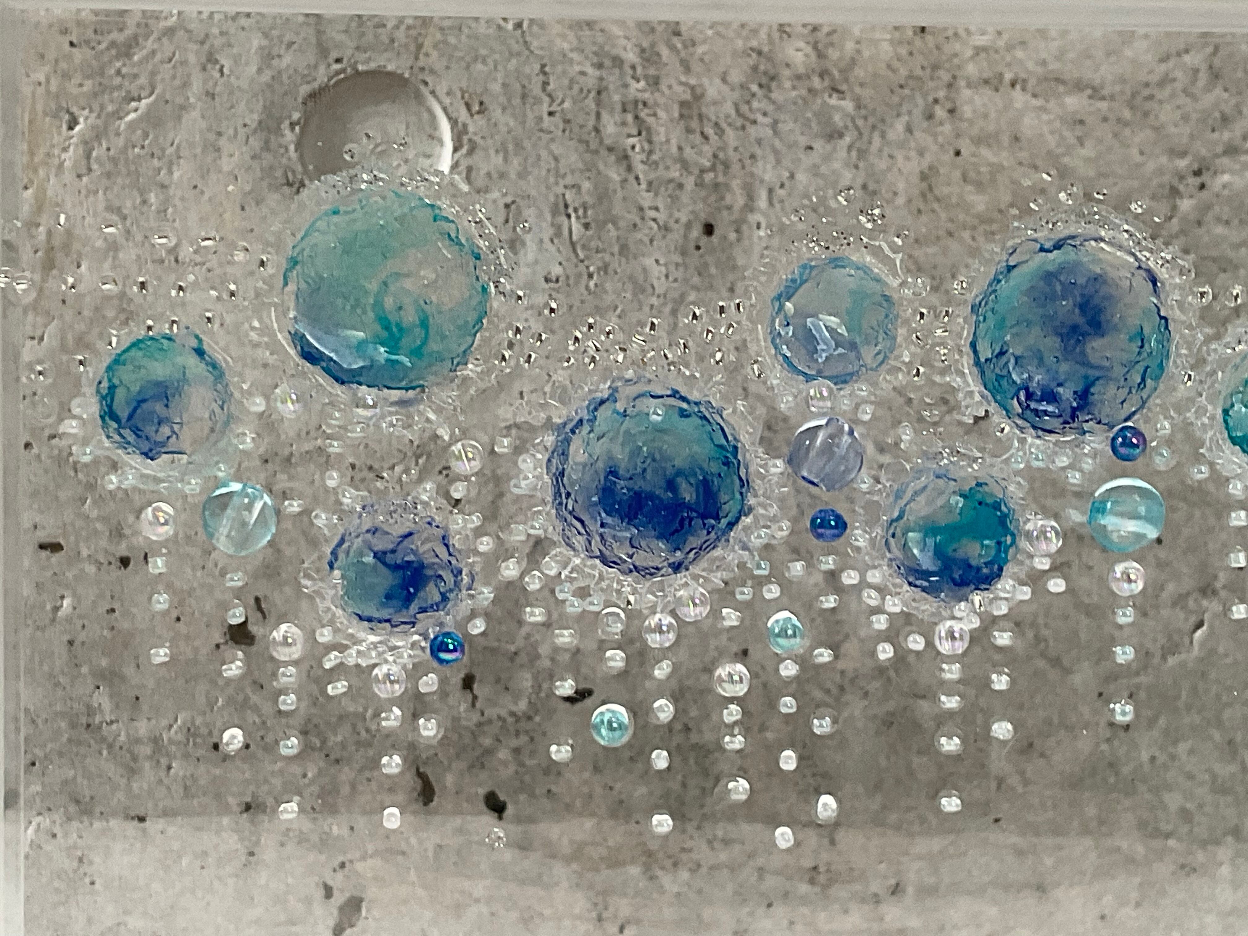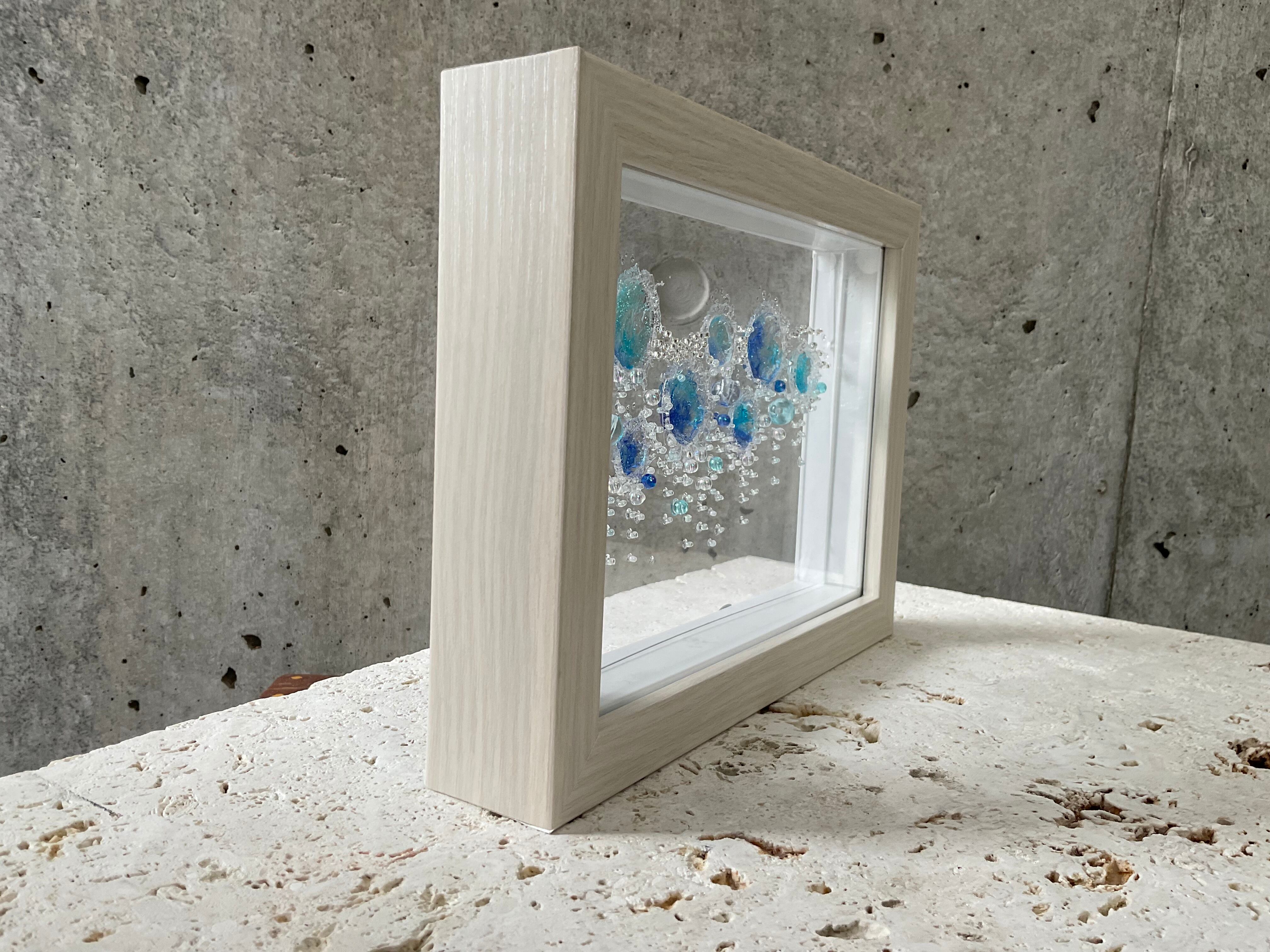 この絵画は、光り輝く海の泡をテーマにした一点物のアート作品です。ブルー、エメラルドグリーン、シルバーの色彩が絶妙に混ざり合い、幻想的な雰囲気を醸し出します。レジンとビーズを使用した独自の技法により、光が当たるたびに乱反射し、立つ位置により異なる表情を見せるのが魅力です。まるで海の波間に漂う泡が、静かに、そして煌めきを持って浮かび上がるような美しさを感じられます。